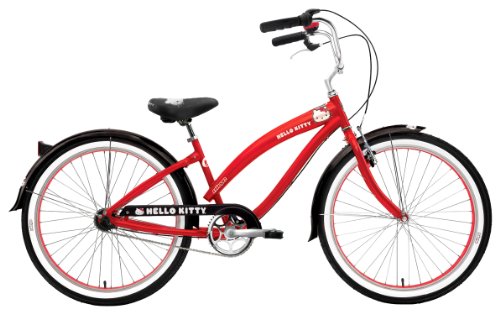 Cruise in style with the Nirve Hello Kitty 26in Retro Ladies 3 Speed Red Cruiser! This bike features a 16in Nirve proprietary Galaxie aluminum frame with 3 speed gearing. It comes equipped with a front hand brake and rear coaster brake, 26in white wall tires, aluminum wheels, and Nirve Kandy Bars (ergonomic handlebars). With an awesome red/black color with Hello Kitty classic paint and graphics, Hello Kitty comfort saddle, and Hello Kitty Bell-this bike is sure to stand out! Get cruisin with the awesome Nirve Hello Kitty 26in Retro Ladies 3 Speed Red Cruiser!