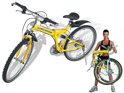 Throw the Yellow full size 21-Speed folding mountain Bike in your car trunk and head for the mountains. Ride it down rugged hiking trails. Roll down the street to the supermarket. Cruise along the boardwalk as you enjoy the sunny skies. The advanced front and rear braking system stops on a dime. The 26-inch knobby tires with reinforced walls provide more stability for rocky, roads or concrete promenades. Molded metal pedals with teeth provide your shoes a firm grip. It's constructed of super durable aluminum alloy and steel. Three shock absorbers cushion your ride on the harshest terrain. Ergonomic seat adjusts for nearly any rider. Adjustable handlebars with dual grip can be set for cruising or climbing.