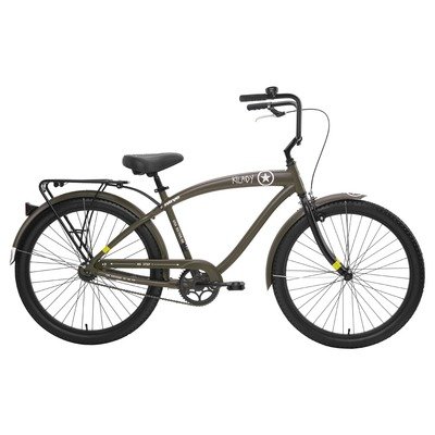 Cruise in style with the Nirve Kilroy Mens Olive 1-Speed Cruiser! This bike features a 18in Nirve Proprietary Galaxie frame, WWII themed paint and graphics, and 1 speed gearing. It comes equipped with a front hand brake and rear coaster brake, 26in classic tread tires, aluminum wheels, and a welded cartridge kickstand. With an awesome olive green color, Nirve Kandy bars (ergonomic handlebars), and vintage style comfort saddle- this bike is sure to stand out! Get cruisin with the Nirve Kilroy Mens Olive 1-Speed Cruiser!