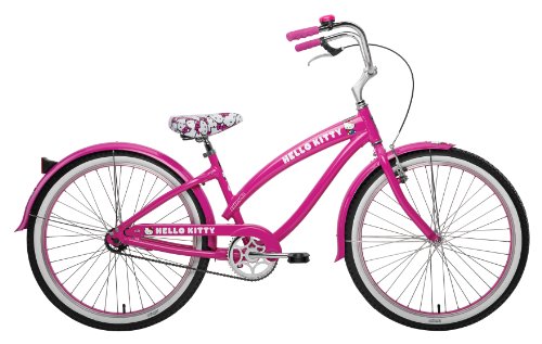 Cruise in style with the Nirve Hello Kitty 26in Classic Ladies 1 Speed Pink Cruiser! This bike features a 16in Nirve proprietary Galaxie alloy frame with 1 speed gearing. It comes equipped with a front hand brake and rear coaster brake, 26in white wall tires, aluminum wheels, and Nirve Kandy Bars (ergonomic handlebars). With an awesome pink color with Hello Kitty Graphics, Hello Kitty comfort saddle, and Hello Kitty Bell-this bike is sure to stand out! Get cruisin with the awesome Nirve Hello Kitty 24in Ladies/Girls Pink Cruiser!