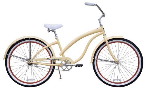 Classic single speed beach cruiser bicycle which is a coaster brake bike. Womens cruiser bike that has a low frame easy to step over. Vintage style with balloon tires but updated look with thick frame and updated seat and grips. Comfortable seat with springs makes riding comfortable and enjoyable.